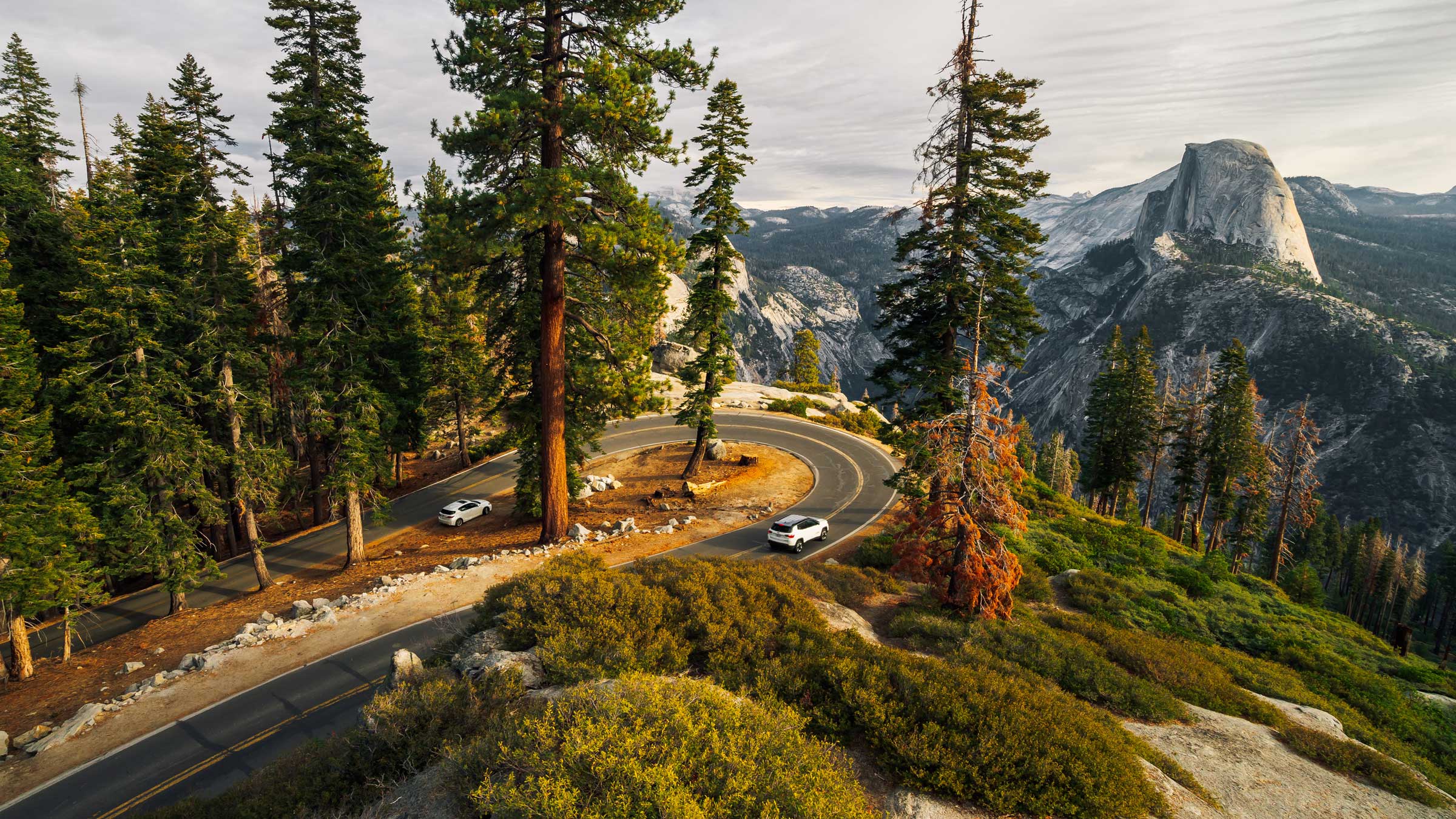 Three separate roads in Yosemite are close enough together that all can be traversed in five hours or so, if one was so inclined. Yosemite Valley, 195 miles southeast of San Francisco, boasts far more than its share of natural icons visible from the road: Highlights include 620-foot Bridalveil Fall, the massive granite monolith of El Capitan, 1,000-foot Horsetail Falls, Yosemite Falls (three falls totaling 2,425 feet), and Half Dome. The famed overlook Tunnel View, on the road out of Yosemite Valley toward Wawona, offers what is perhaps the park’s single most famous vista. To the south, Glacier Point Road climbs up to Glacier Point, 3,200 feet above Yosemite Valley, another awesome panorama of the valley, peaks, and waterfalls. Bisecting the park to the north of the valley, Tioga Road runs west–east to cross the Sierra Nevada via the 9,945-foot Tioga Pass. Originally a wagon road built in 1883, Tioga Road ascends into an alpine world of snowy peaks, crystal lakes, and meadows bright with wildflowers.